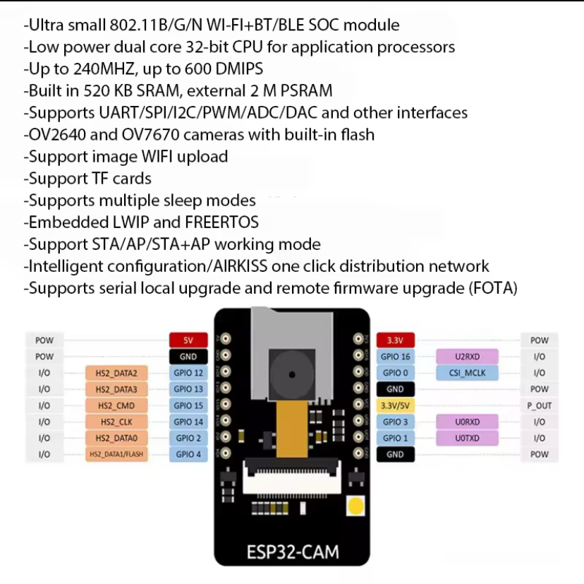 4. Easy to use, ESP32-CAM is a micro module with camera function, equipped with OV2640 camera, GPIO connected to peripherals, and micro-SD card for storing captured images, which can be directly plugged into the base plate.